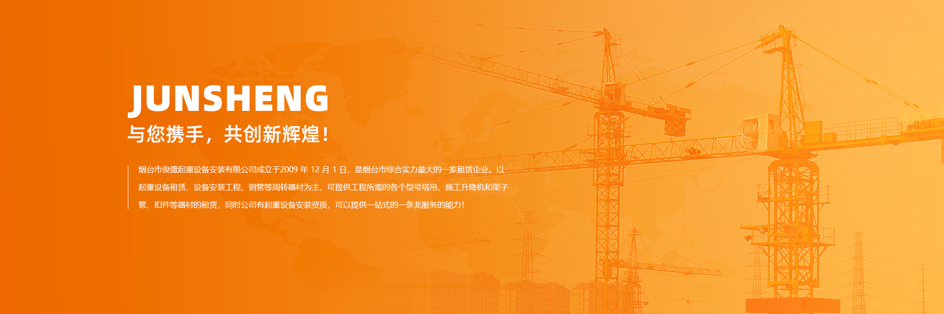 烟台市俊盛起重设备安装有限公司成立于 2009 年 12 月 1 日,是烟台专业的租赁企业。